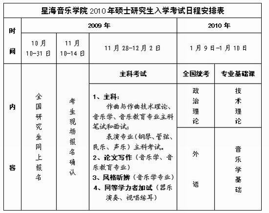 星海音樂(lè)學(xué)院2010年碩士研究生入學(xué)考試日程安排表